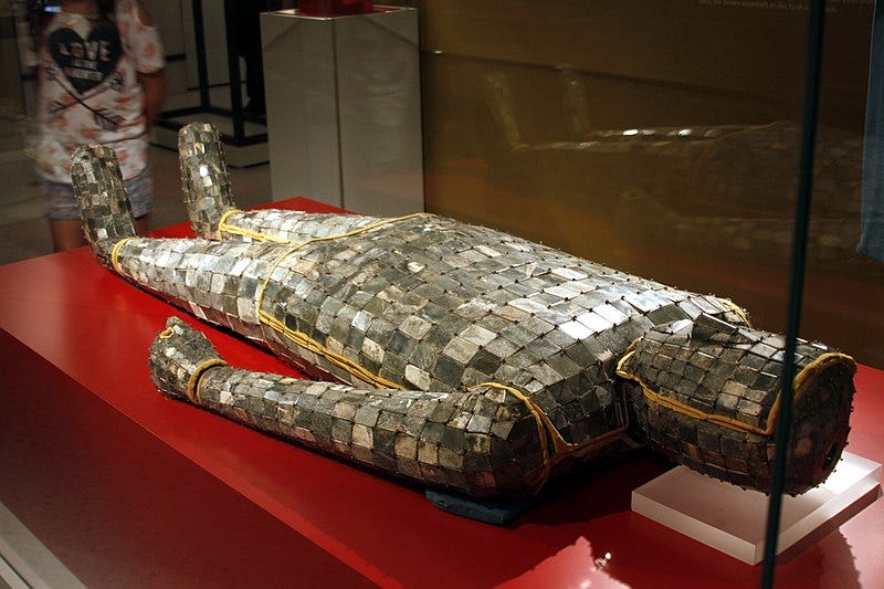 Next we have early Han Dynasty tombs with princes completely wrapped in suits made out of small jade tiles. The idea, we think, was to keep their bodies from decaying which itself was to have some role in preserving their integrity in an afterlife. The Chinese see Jade as a liquid moving so slowly it appears as stone. Jade thus represents epic periods of time and power. The argument that there was some concept of an afterlife at this time is strong. We just don’t know much about how they conceptualized it. Tombs from this era also contain recipes for extending or preserving life; listing plants, fungus, minerals, daoyin [quick into to daoyin this video], and spells. The stuff in these tombs poses the question, what did they think death was all about? These princes were also buried with libraries! Why? Was death a good place to catch up on reading? And enjoy prized possessions. There are jade lamps with images of immortals with wings flying around in misty mountains. There are carved jade dishes designed for capturing the morning dew on sacred days, the dew was mixed with medicines and ingested, an early model for the Golden Elixir. This idea of the immortal (xian) is the subject of the next essay, number 4. It changes over time paralleling the many unique techniques for making the Golden Elixir.